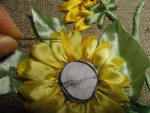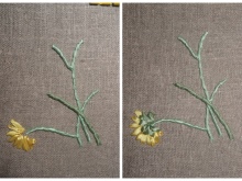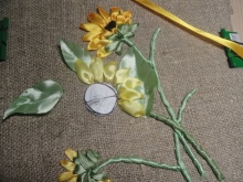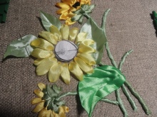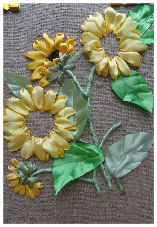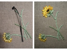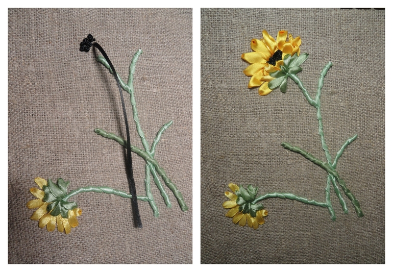 - Once finished with the stems, you can go to the sunflowers themselves. It would be advisable to start with small flowers, embroidering petals, and then sepals. Large sunflowers require a bit of a different tactic. We glue the middle with a paper circle and embroider the petals and the sepal.