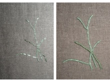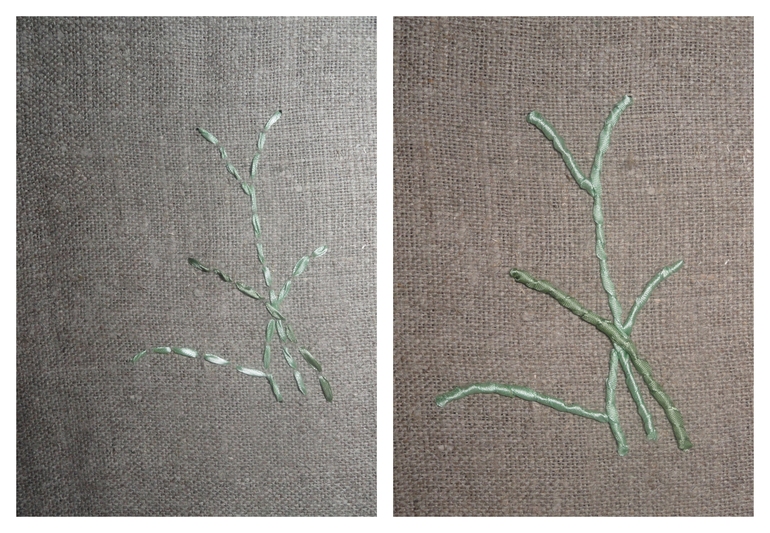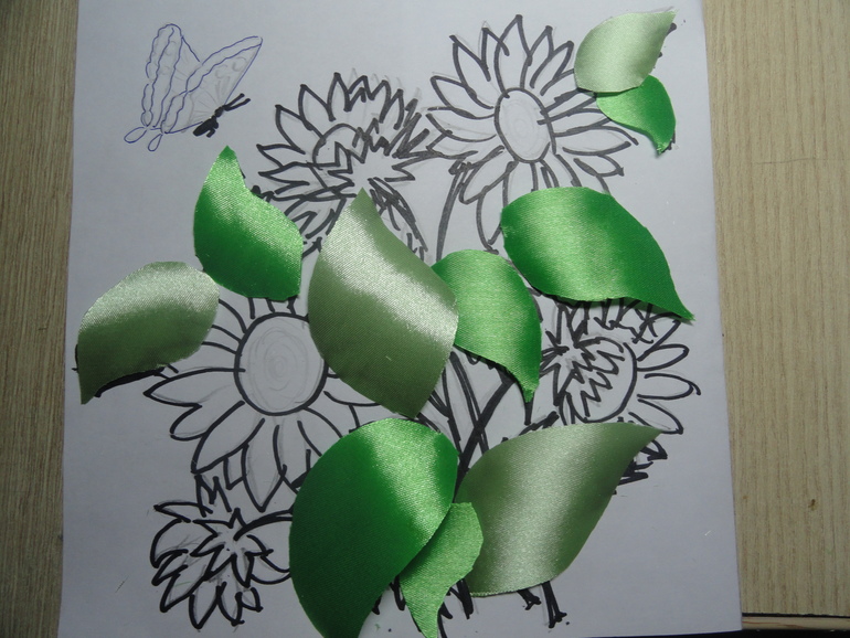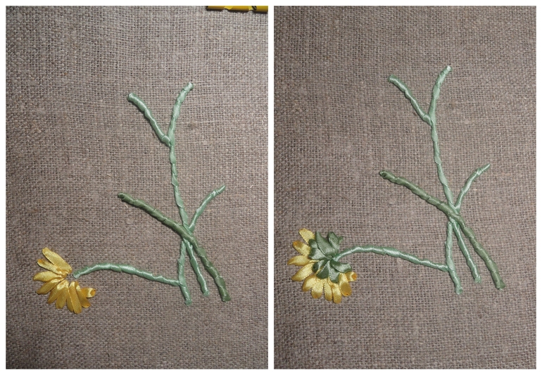 - Secure the fabric well, and begin the process by embroidering the stalks and leaves. Simple standard stitches will do, but at the end of the work you need to twist them with a ribbon. The tape will need to be twisted, otherwise the picture will turn out unrealistic. It is good to use a knitting needle in this business, it passes perfectly through the fabric and facilitates the process of withdrawing a needle.