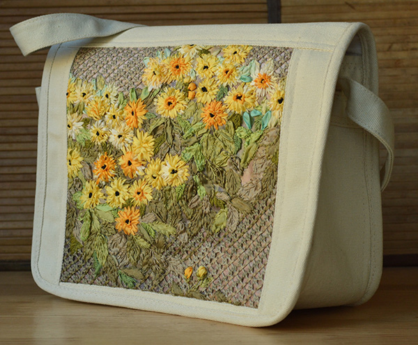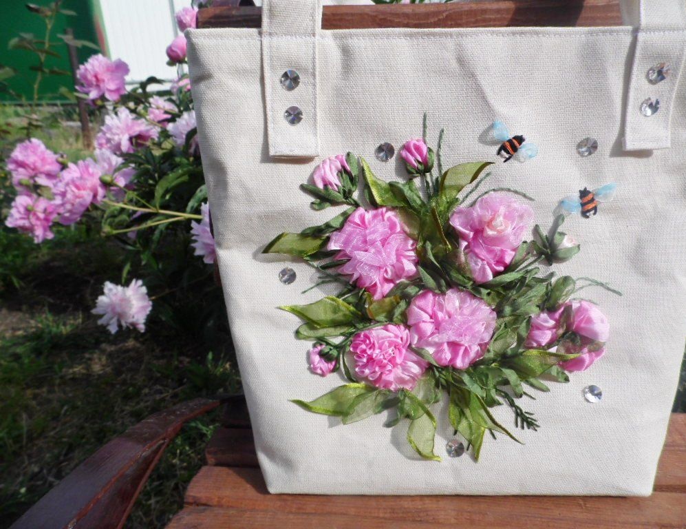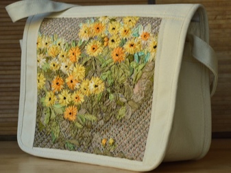 To embroider an interesting appliqué, you will need a needle, a sketch with a pattern, a satin fabric of the desired colors, and, of course, a textile bag: