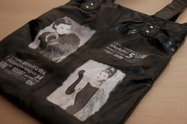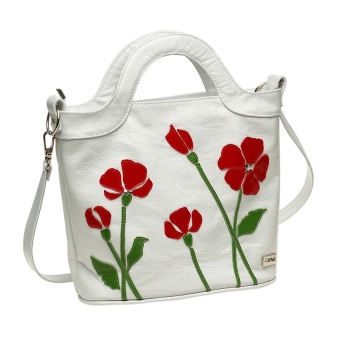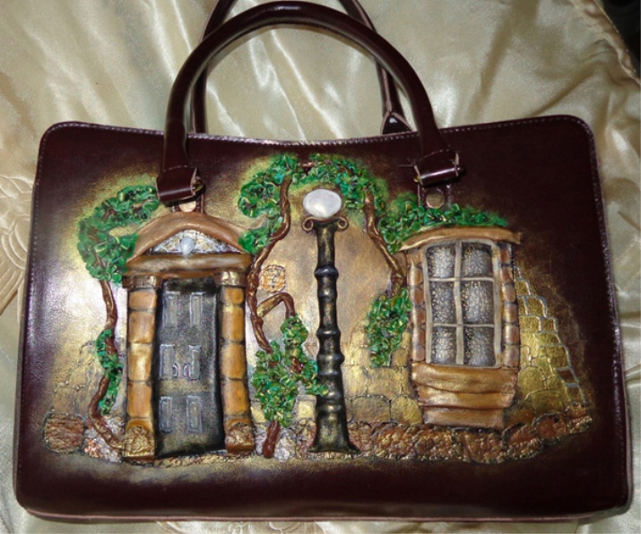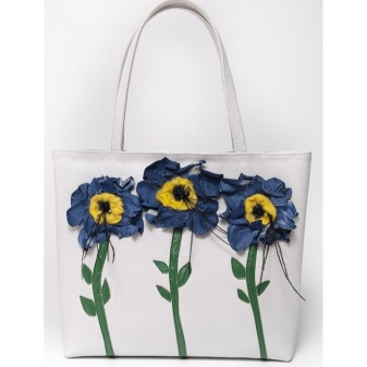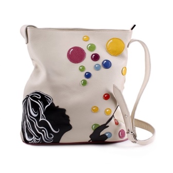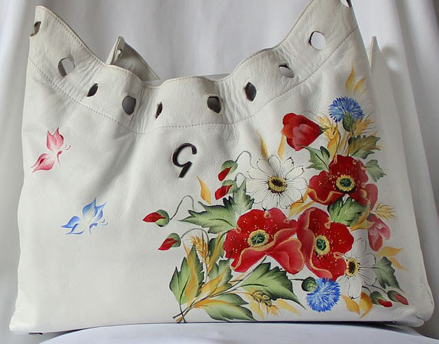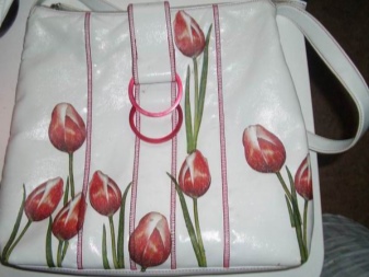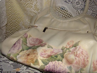 On leather white bags looks great bright color decoupage. And it can be not only big flowers. An unusual solution will be unusual geometric shapes, faces, surrealistic pictures. Perfectly look contrasting images of birds, animals and trees.