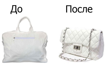 Decorating a simple white handbag is always interesting, because you yourself create a personal masterpiece. If the printing of prints or applications in your plans is not included, you can simply update the color.The main disadvantage of white is that it quickly gets dirty and acquires unpleasant scuffs that cannot be removed. Purchase a special paint to match your bag and apply it to the product.