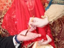 Then conduct the rite of betrothal, and also twice. A small betrothal is carried out in the house of the bride. A trusted fiancé puts a ring on the bride's finger and a scarf on her head. After he eats half of the sweet treats offered to him, the rest belongs to the groom.