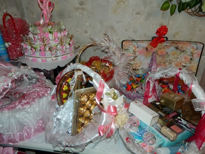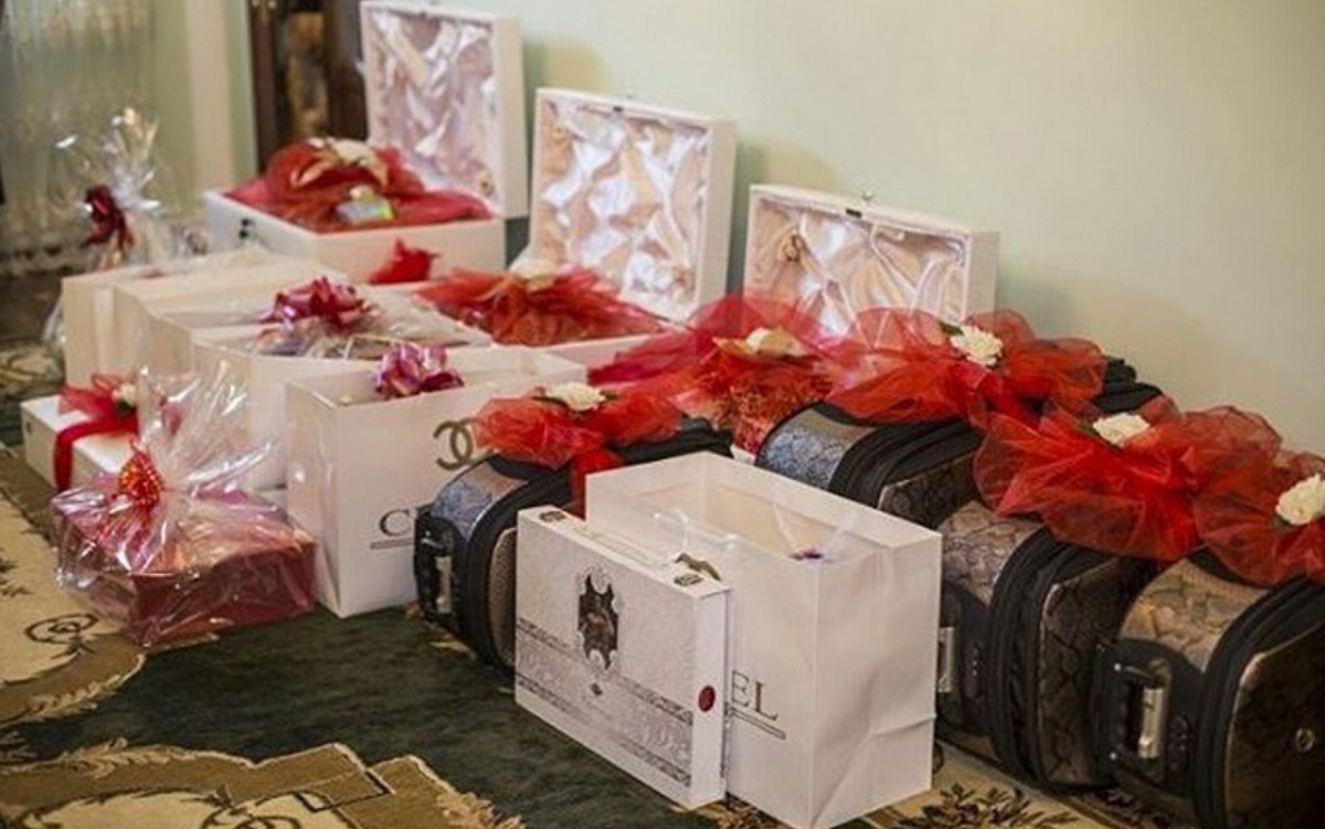 In preparation for the wedding, the groom's family gives the bride various gifts: beautiful fabric, decoratively decorated dresses, scarves of various colors, decorations.