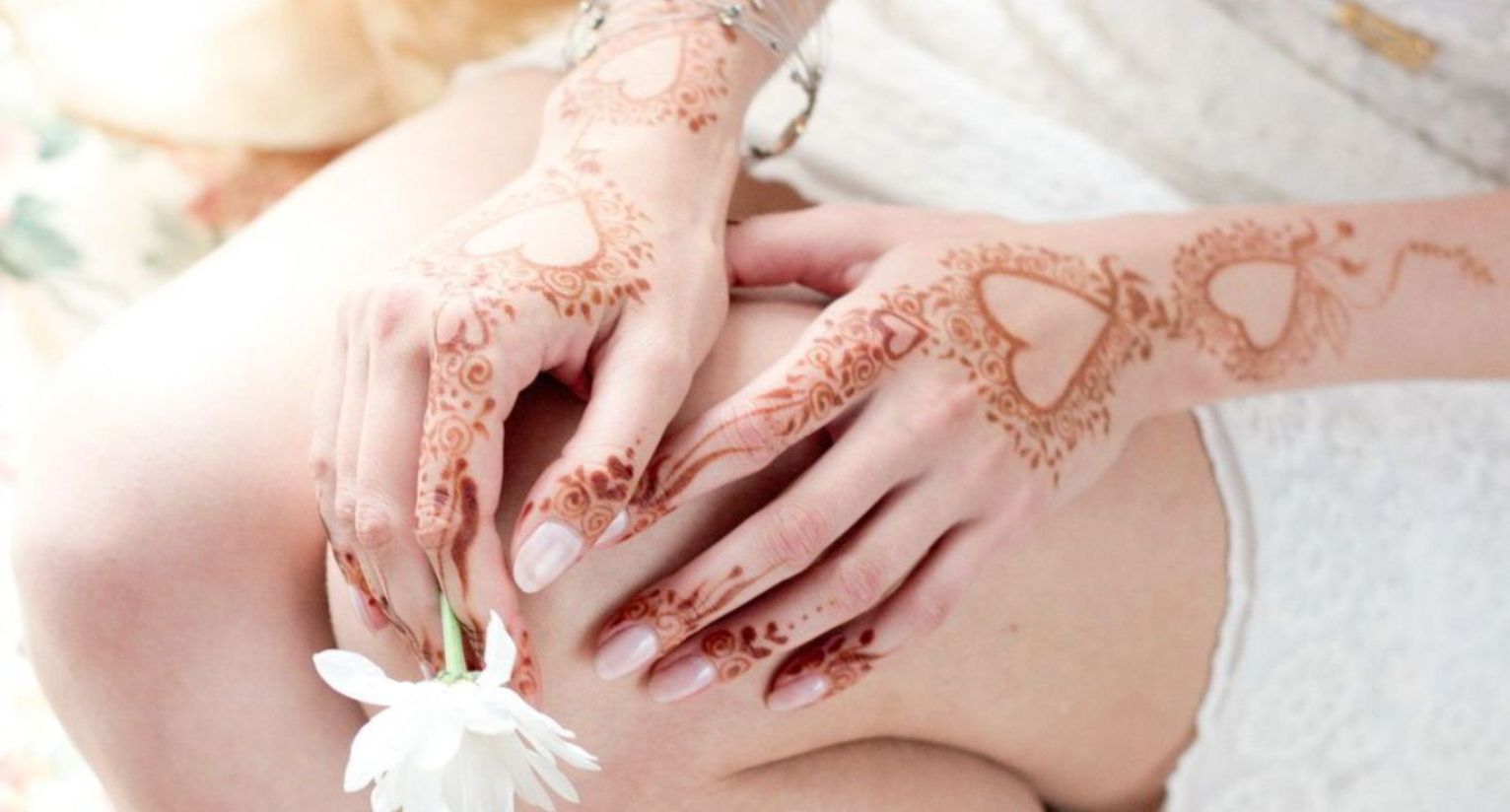 Before the wedding, the bride's hands are decorated with intricate henna patterns.