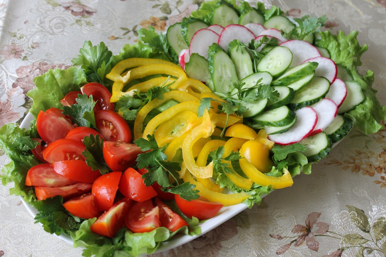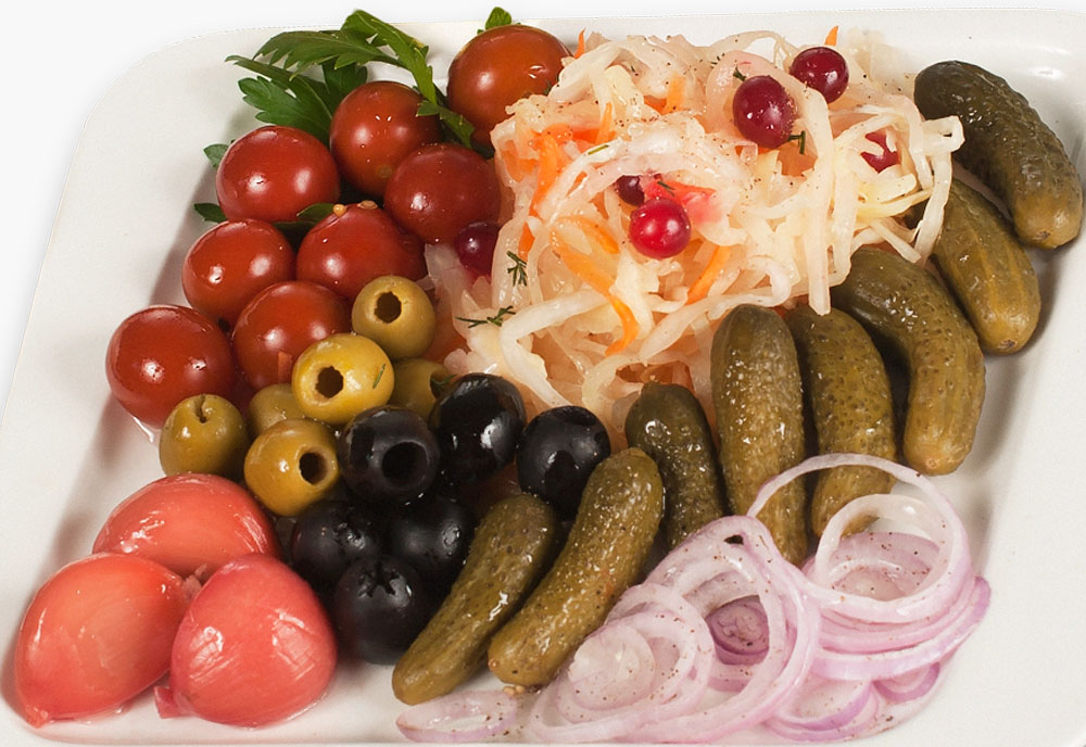 Cutting a variety of vegetables and pickles not only cause appetite, but also represent a kind of table decoration.