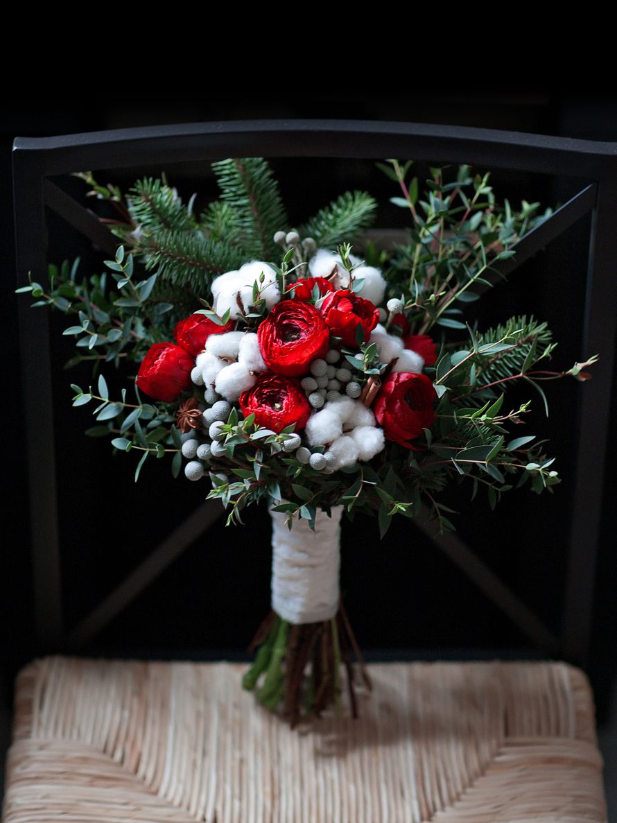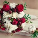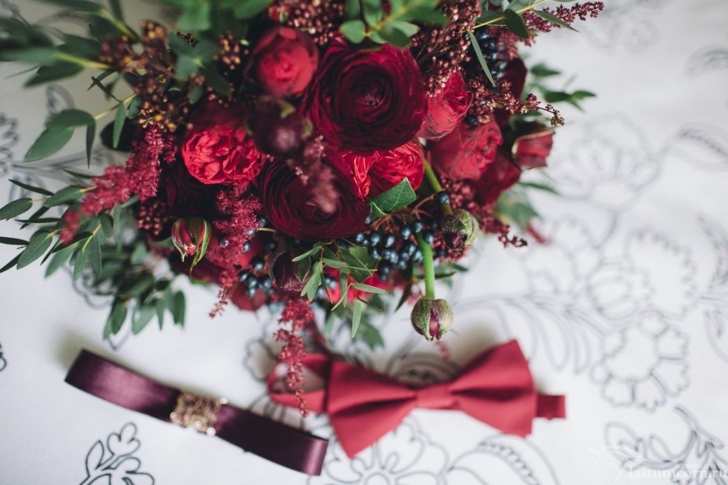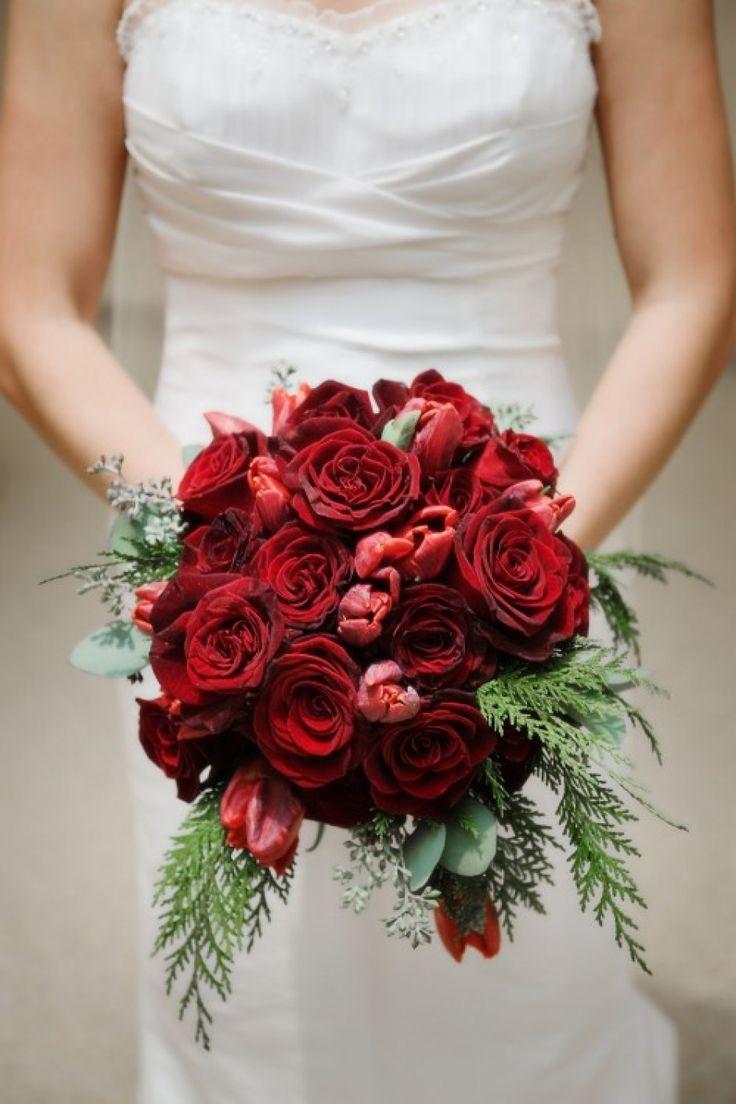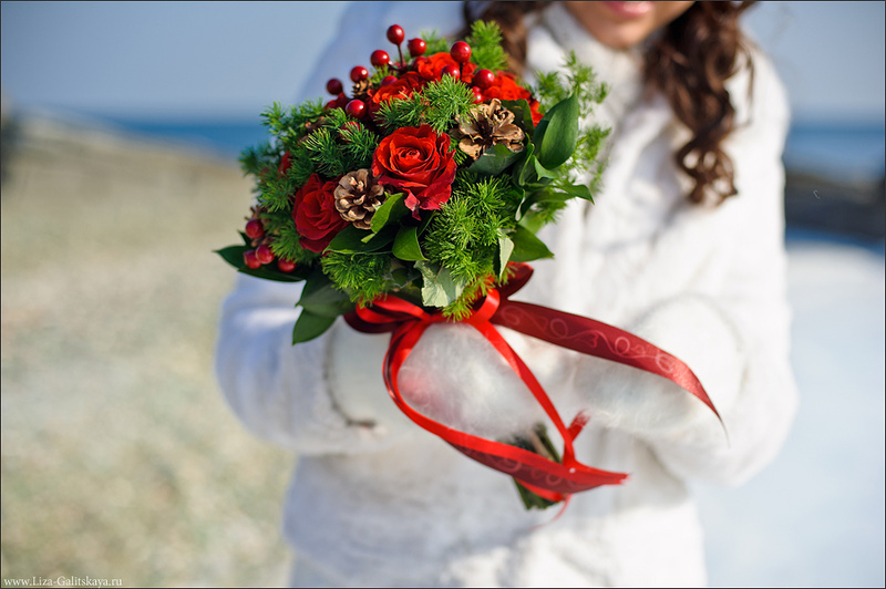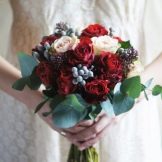 Bouquet for the winter wedding perfectly complement the fir branches, berries. The color of accessories can be either burgundy or any other. The best is white, which can slightly dilute the saturated marsala.
