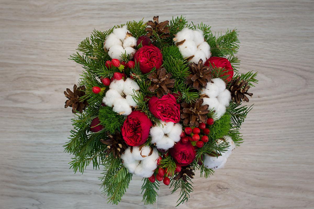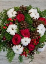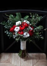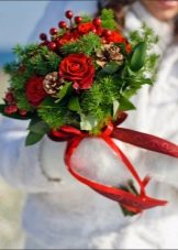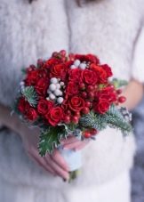 The bouquet looks very beautiful, from under the buds of which dark green leaves peeking out. They give the composition a special appeal. In winter, leaves can be replaced by coniferous branches.