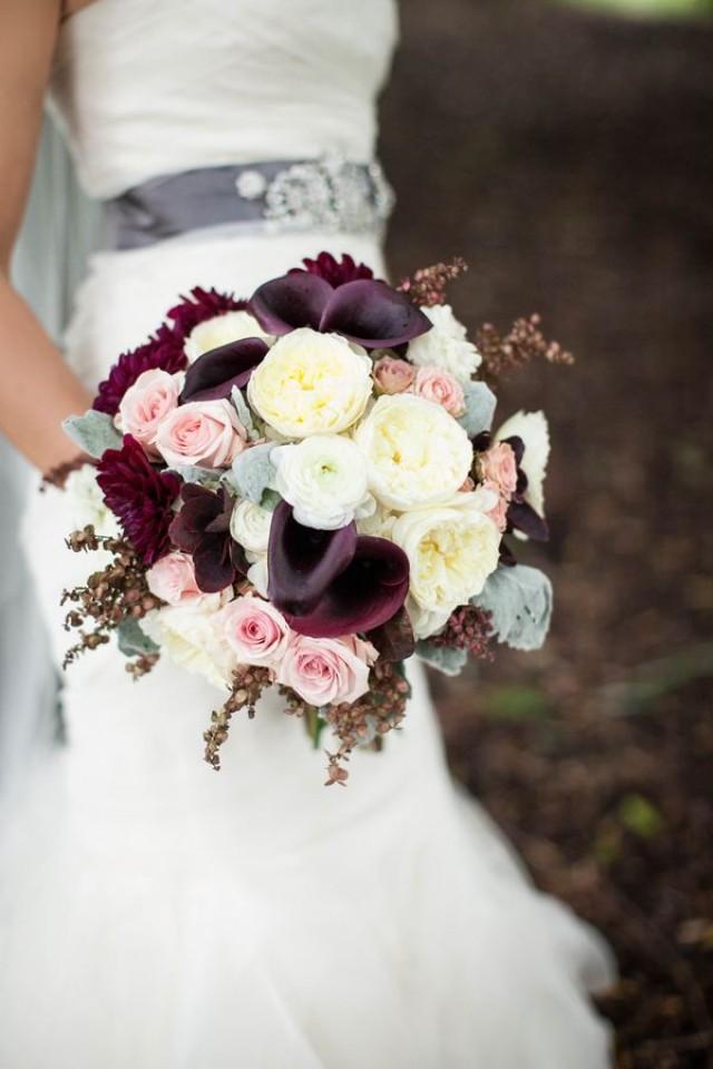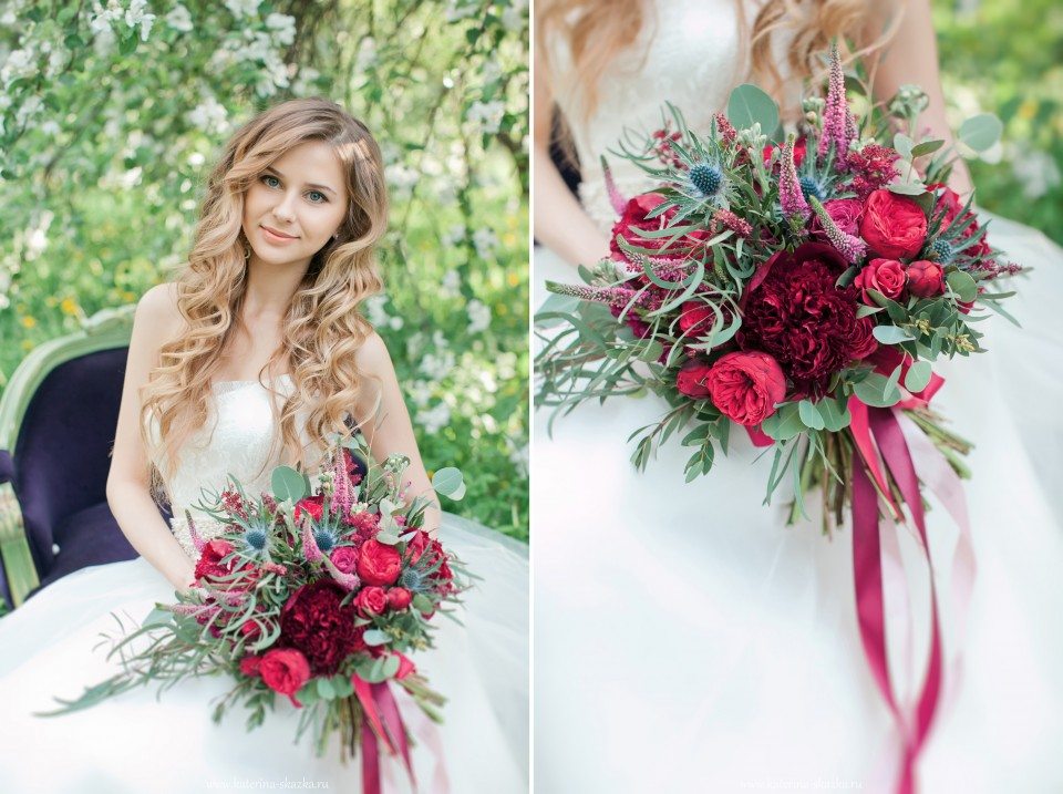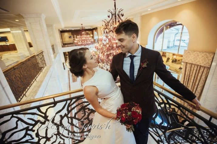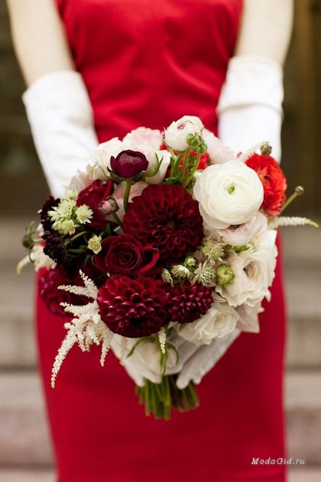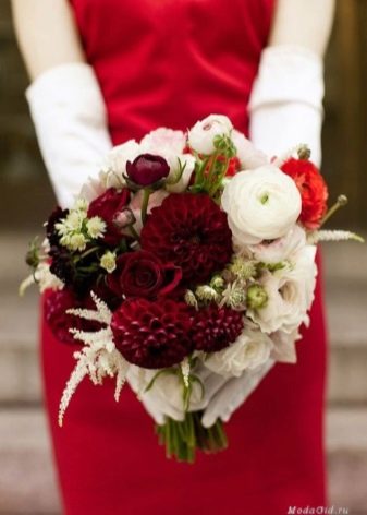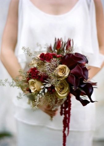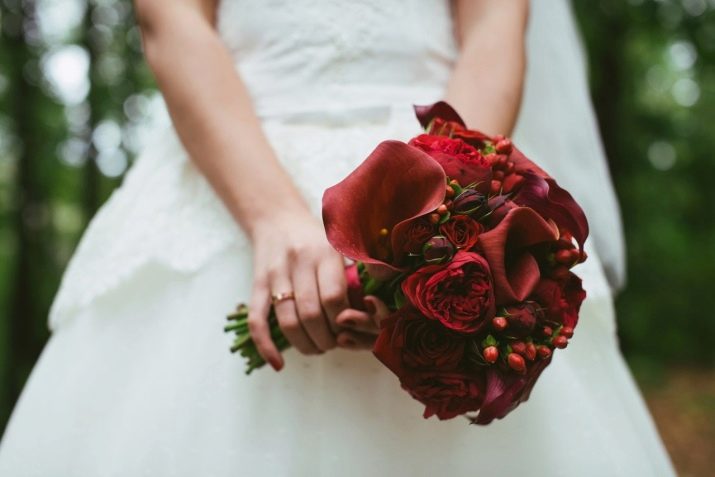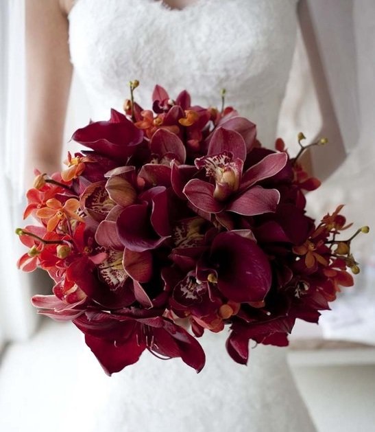 Florists consider flowers of this shade to be an excellent option for a wedding held in the fall or winter. It is also suitable for the summer event, but only at the very end of this season. If the bride wants a spring wedding, then the shade will have to be diluted with lighter and lighter colors. By the way, not every woman will suit a bouquet of this color range. As a rule, it looks organically in the hands of bright brides with dark hair and fair skin. It will suit the red-haired ladies, but only owners of cold hair.