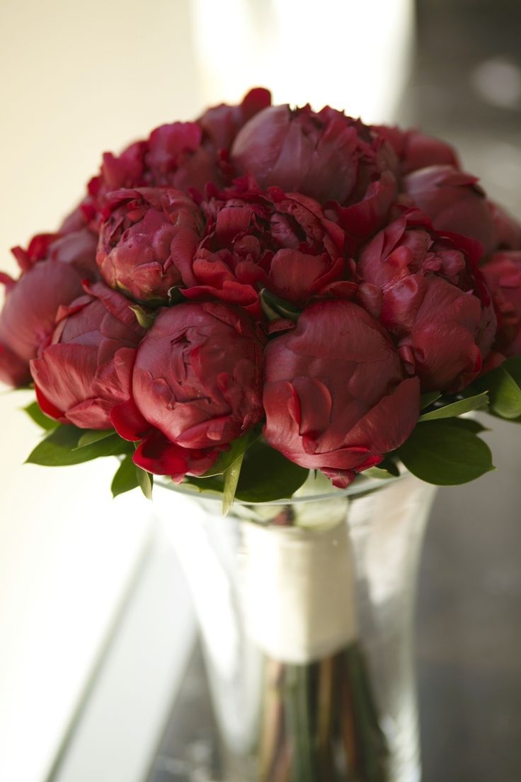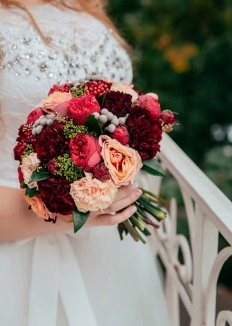 A bouquet of peonies is one of the most common options. A big plus in this case is the gentle look of even large buds. Burgundy peonies are also a symbol of emotions, passion and love, but this is not a storm and a hurricane, but calm, comfort and warmth. These flowers are self-sufficient, and they are well combined with other species.The democratic value, especially in spring and summer, prompts many brides to give preference to peonies. To create an image in the style of Chanel, you can take white peonies and add to them burgundy callas or hydrangeas.
