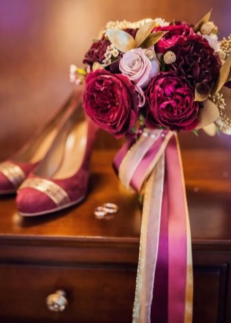 Another tone that perfectly complements the wine - pink. No less good in such a company and peach.Flowers of these shades will give a bouquet a romantic look, in it warmth and sensuality will be combined. Some brides choose several colors at once, smoothly changing from rich marsala to pale pink or white. This accessory looks not only stylish, but also very feminine.