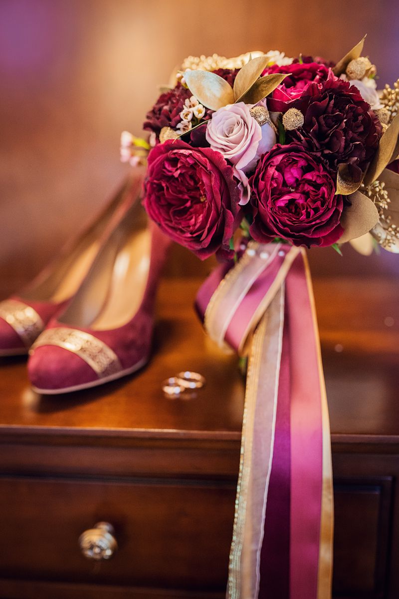 For a luxurious event, a bouquet of Marsala colors with gold framing is suitable. These two shades perfectly complement each other and give the image a special chic.