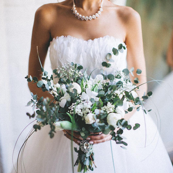One of the varieties of the bouquet in the style of "chebbi-chic" is a Greek bouquet. The bouquet is richly diluted with myrtle twigs, laurel and leaves of wild grapes. A cascade assembly is possible when the “tail” of green and large flowers loosely fixed in an arbitrary shape falls out of the main round bouquet. In the design of this style of wedding always pompous carved furniture, gilding, whiteness, pastel shades in the design, lush crinolines, flowing lines, long and airy veils of the bride, trimmed and adjusted curls, tuxedo and gloves. Style of luxury and tradition worship.