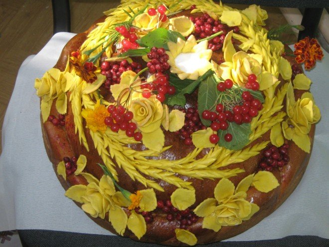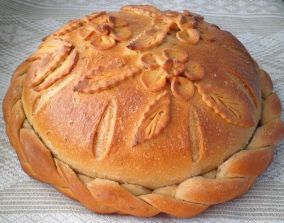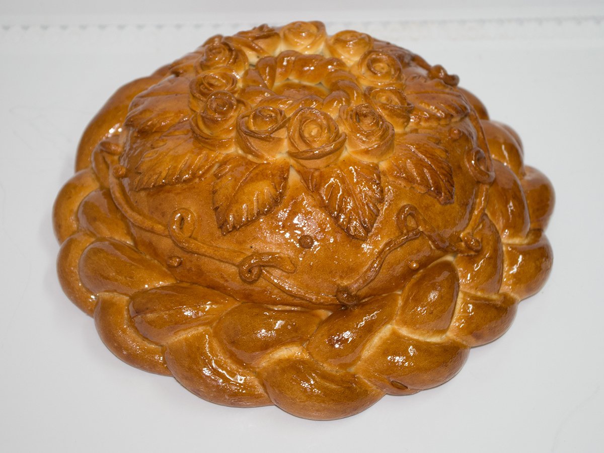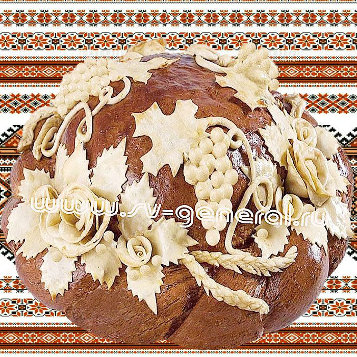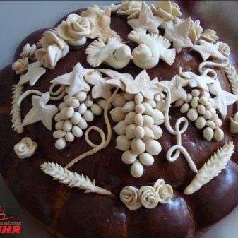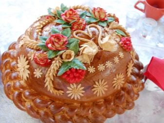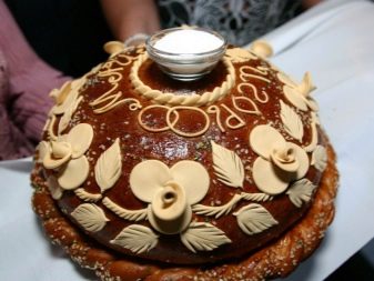 When serving loaf, it is necessary to put salt shaker on it, so that the young people should eat bread and salt. To prevent the seasoning container from tipping over, a small dimple is made right inside the loaf. During cooking, cut a small notch in the center of the cake, decorating its edges with various patterns in the form of ears or braids.