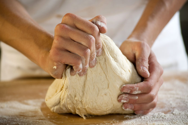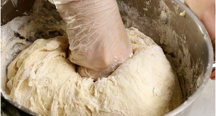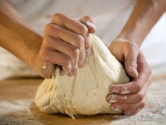 - Knead the dough well until it stops sticking to your fingers.It should turn out to be a homogeneous and smooth mass, which should be covered with cellophane and wrapped in a towel so that it does not become covered with a hard crust. Put the parcel in a warm place for two hours to raise the dough. When the mass increases in size, it must be kneaded again and cut off a fourth part for decorations.