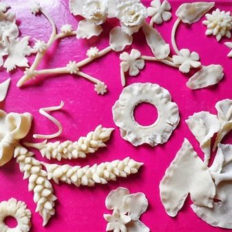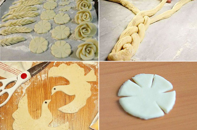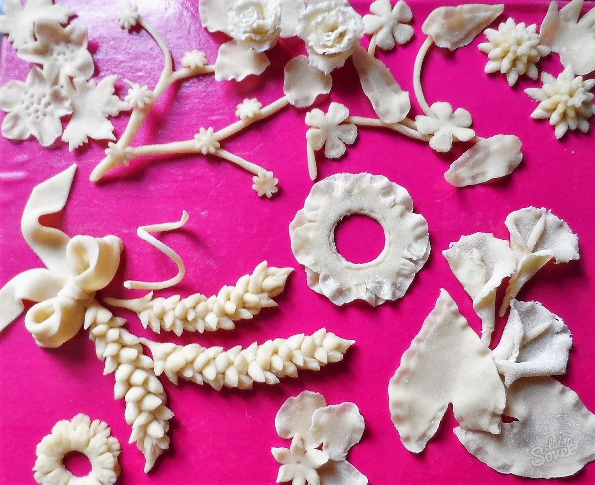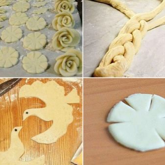 For the dough for the figures will need 1 cup of water, 3 cups of flour and 1 tsp. salt. Mix flour with salt, add water and knead the dough. Roll out with a rolling pin and make decorative elements, then bake them in the oven. The second option is made from 4 proteins and 2 cups of flour. The ingredients are mixed to obtain an elastic mass. Then you can sculpt the decor.