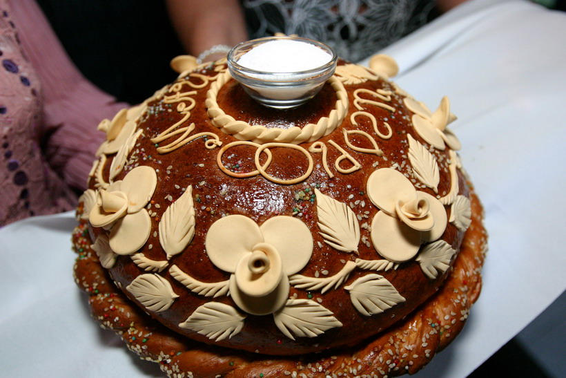 Before bringing the loaf to the young, salt is poured into the recesses or they put the salt shaker. A newly-born husband and wife should break off a piece of bread, dip it in salt, and then eat it. In this way, a ritual is performed, denoting that the couple ate a pound of salt, and henceforth the young will live happily ever after.