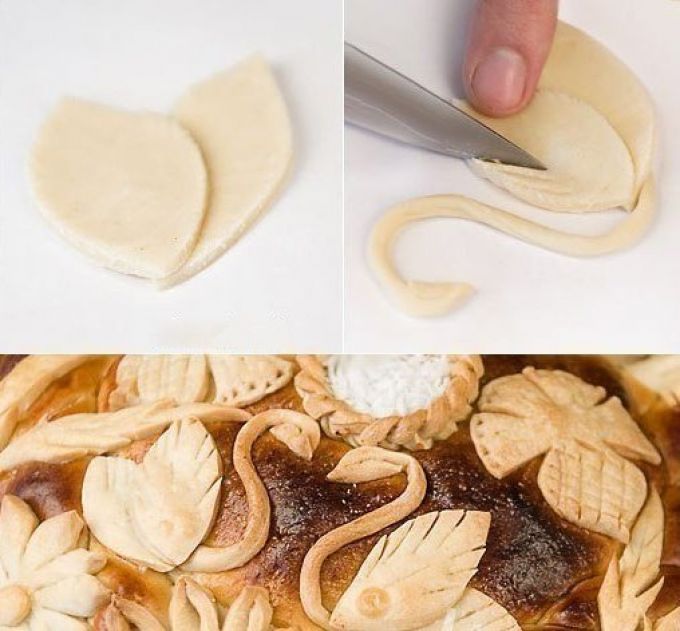 - Take care of decorating the dish. Taken in advance, a piece of dough needs to be rolled out into a thin layer and the shapes cut into shapes. You can weave a pigtail and wrap a pie with it. To keep the decor well, it should be moistened with water before attaching.