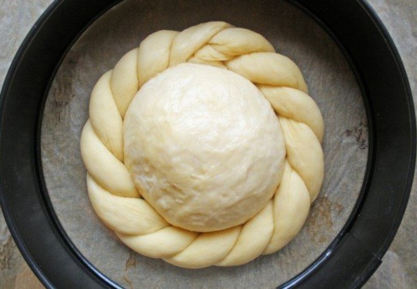 One fifth of the mixture is set aside for decorations, form a circle from the remaining piece and put it on a baking sheet with baking paper. Cover the loaf with a towel and put in a warm place to rise. Roll a piece of dough into a thin layer and cut out the decorations, sprinkle them with water and send them under the towel to the cake.