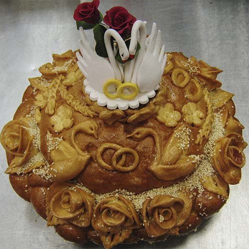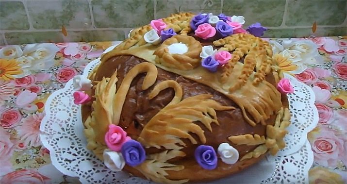 A wedding loaf is not just a cake for a festive ceremony, but a whole work of art. Every woman can bake such beauty, but few can make unusual decorations. Wedding bread has a classic round shape, symbolizing the sun and heat. Along the edges of the cake is decorated with a lush pigtail. On the surface there are images of swans and rings. Neat and miniature roses contribute a certain flavor to the overall picture.