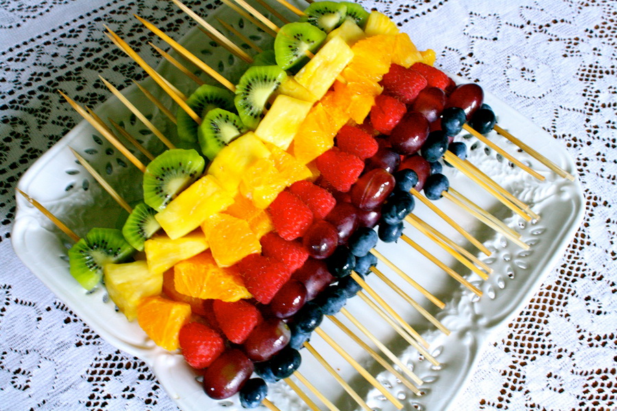 - Fruits on a skewer. Very tasty and elegant, especially if you dip the berries in a chocolate fountain.