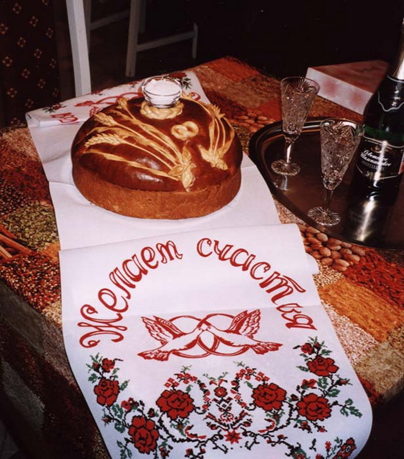 Serving a loaf on a tray is strictly prohibited. According to Russian custom, there should be no stand. Baked bread is placed on a bench, and on top of it is placed salt shaker, filled with salt. It is important to know that a towel, that is, a towel, must be long, but not in contact with the surface of the earth. At the moment of meeting the young parents carrying the cake blesses the lovers, saying a specially prepared greeting speech. Not necessarily in a poetic form, as long as the sincerity is felt.