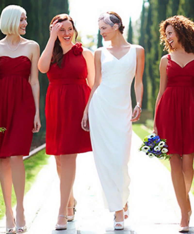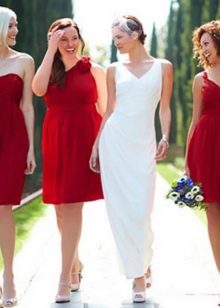 - Features of style. Since girlfriends usually order attire, it is necessary to choose a beautiful and stylish cut that would harmoniously combine with the bride's attire.In this case, it is undesirable to stop the choice on creating an image in a business or austere style; one cannot choose dresses with a deep neckline, as this will give the image of vulgarity. A good choice would be an outfit of the usual cut without a fluffy skirt with a slight asymmetry. As for the length, it can be different - mini, dresses in the floor or models to the knees.