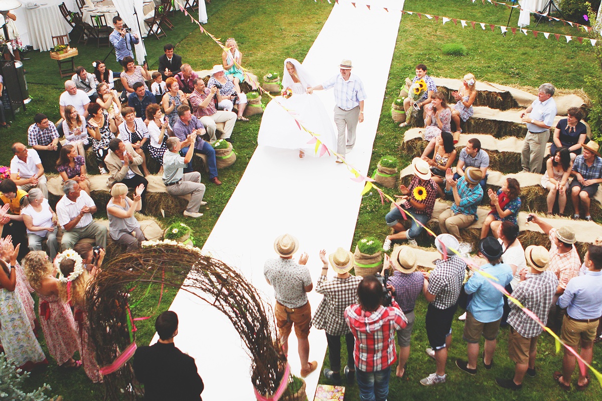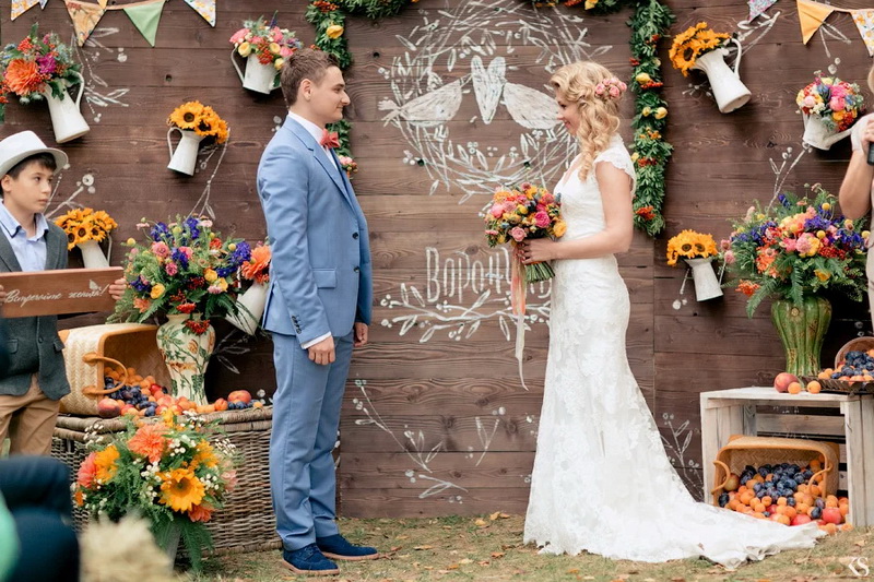 In this case, vases with wild flowers are usually placed on the tables and the decor is complemented with compositions from fruits and vegetables. It is not necessary to dress in Russian folk costumes - kokoshnik and a dress can be safely left in the store. Plain white linen dress and flowers in hair harmoniously fit into this style.