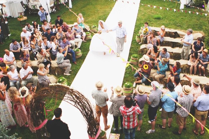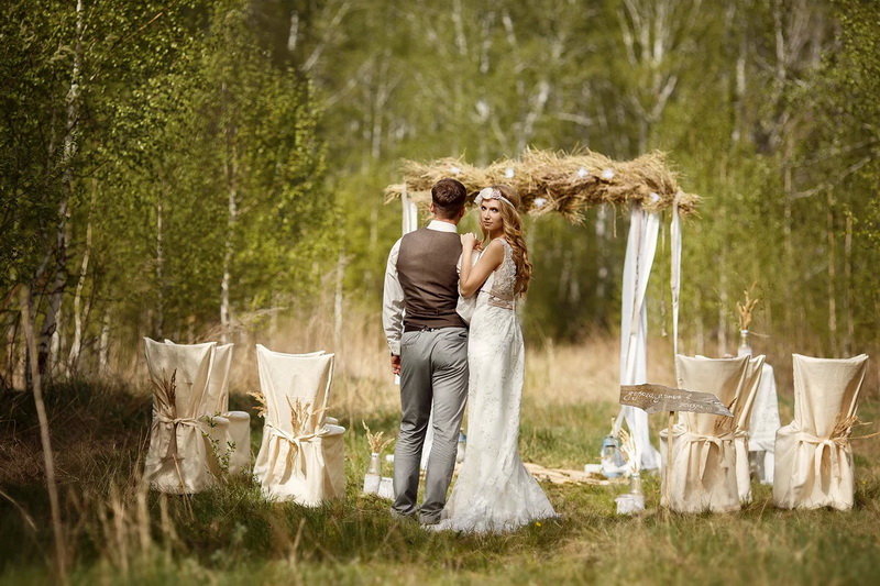 Many people do not even suspect that a themed wedding is actually a rather profitable event. There are some concepts that do not require large investments. For example, a wedding in the style of rustic will be an excellent option for a budget celebration. Here you need only large wooden tables that you can put together from inexpensive boards with your own hands and put them in the yard or in a pretty forest clearing. It makes sense to hang garlands on the trees and make the simplest decor using materials such as sacking and old newspapers.