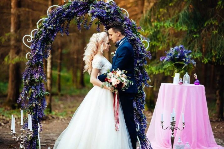 This option is optimal for exit registrations.In this case, the ceremony is carried out in the fresh air, and the arch is decorated with roses. Bright ribbons and flickering decorations, candles and lanterns are hung on the bushes and trees.