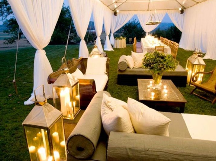 Be sure to equip an area where guests can communicate during small dance pauses. It is worthwhile to think over all the nuances in advance: arrange cozy armchairs, tables and other pieces of furniture, put pillows, decorate the decor with floral wreaths and vases with bouquets. It also makes sense to serve light drinks and snacks. You can go further and achieve even the wow effect. For this, the resting place is covered with a curtain and selected special lighting.