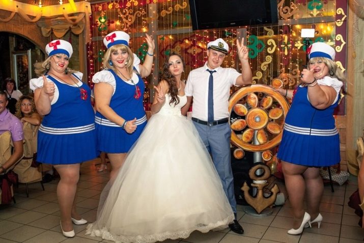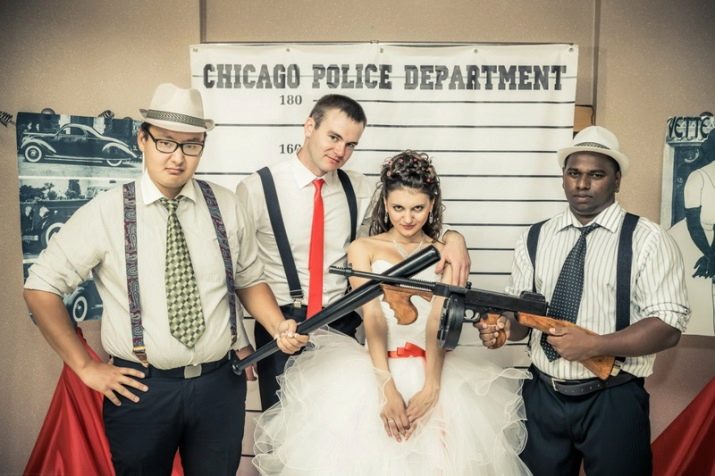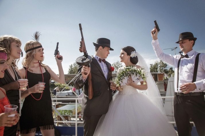 The style of America of the 30s of the last century is very often used at theme parties. Young appear in the guise of mafia times Al Capone. It is quite simple to choose a dress here: a defiant make-up, a bright openwork bandage on the forehead, decorated with feathers, a dress with beads, sparkles and rhinestones, and now the bride already looks like the beloved of dear Don, and he appears before those invited in a flawless three-piece suit, and always in a gangster hat.
