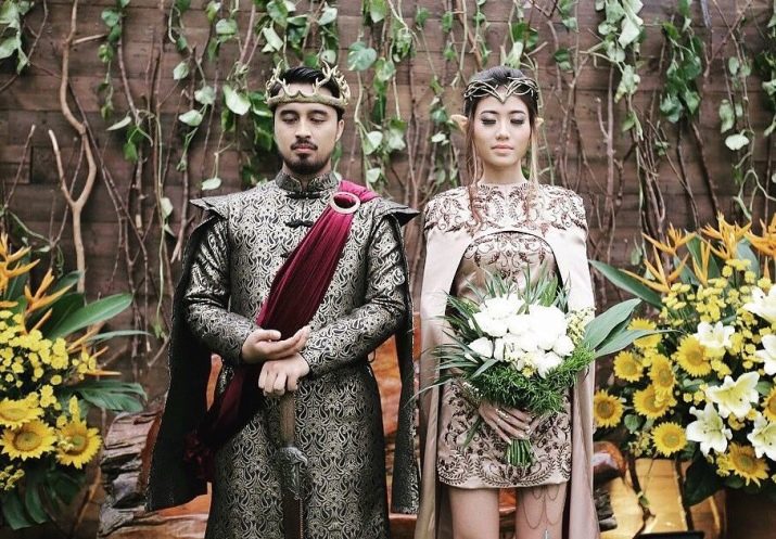 One of the most popular TV shows in the world gives an abyss of ideas for a wedding party. When else, if not on this holiday, young people and their guests can plunge into the medieval atmosphere and feel one of the representatives of the Seven Kingdoms. Make-up and hairstyle should not be particularly bright, everything must fully comply with the atmosphere of that period. A bride can complement her outfit with massive pendants, as well as a crown, a stylish cape with a hood, while a cape made of fur will suit the groom to appear before their guests in the form of John Snow.