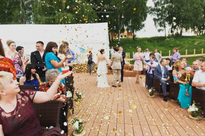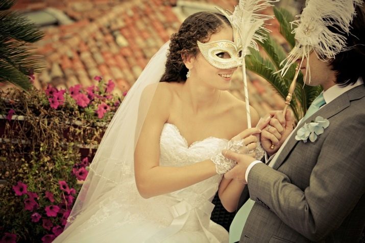 This is a very stylish idea for a wedding celebration: all guests are given stylized masks, and the ladies are also fans. The holiday itself should be replete with fireworks and explosions of confetti. By the way, at the end of the event you can have a fun contest for the removal of masks, surely such a party will long remain in the memory of relatives and young spouses.