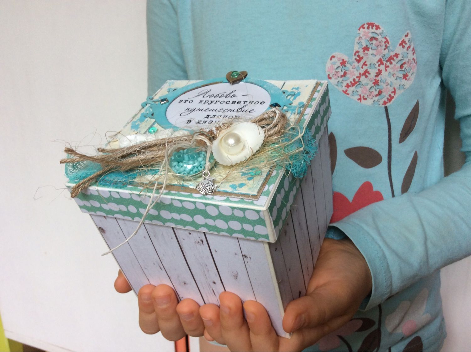 To do this, you can take a regular box and wrap it with bright wrapping paper. Additionally, they use other elements of decor, for example, sparkles, rhinestones, sequins, colorful buttons and much more.