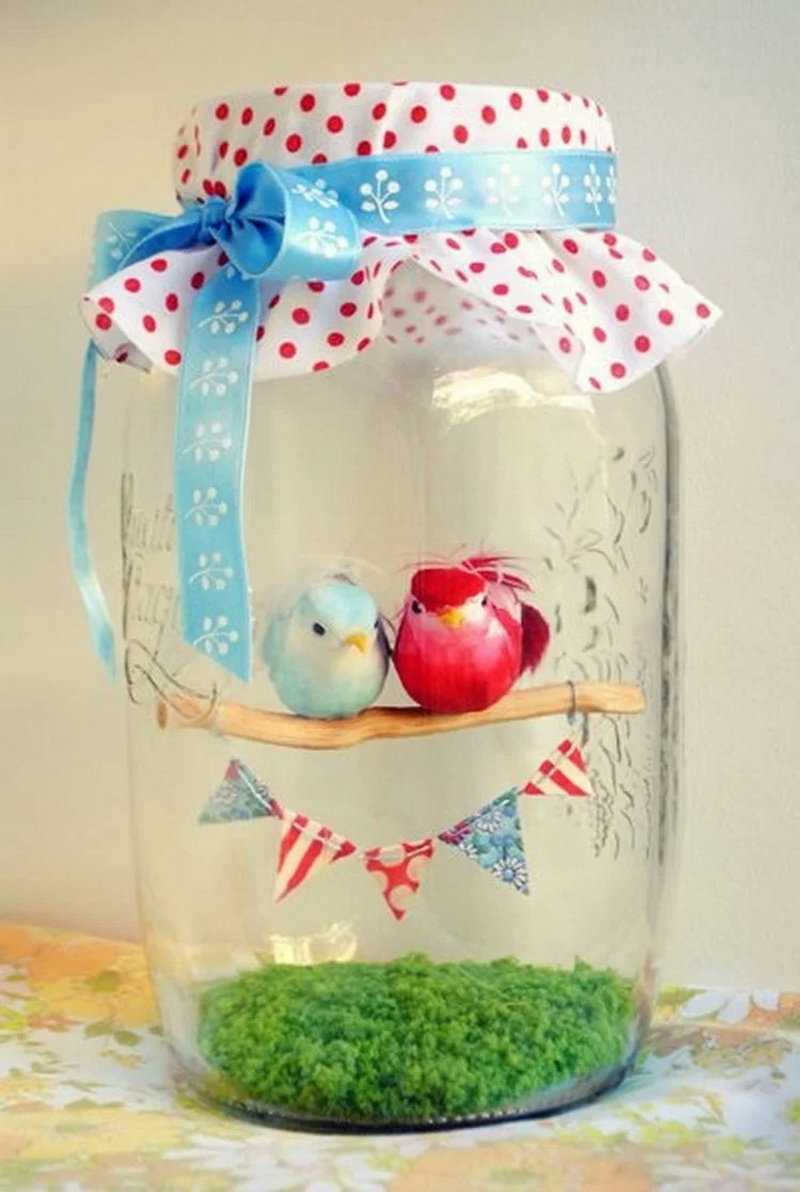 Lovely birds in love in a glass container look beautiful. For their manufacture it is necessary to prepare a glass container with a glass neck, even a regular can will do.