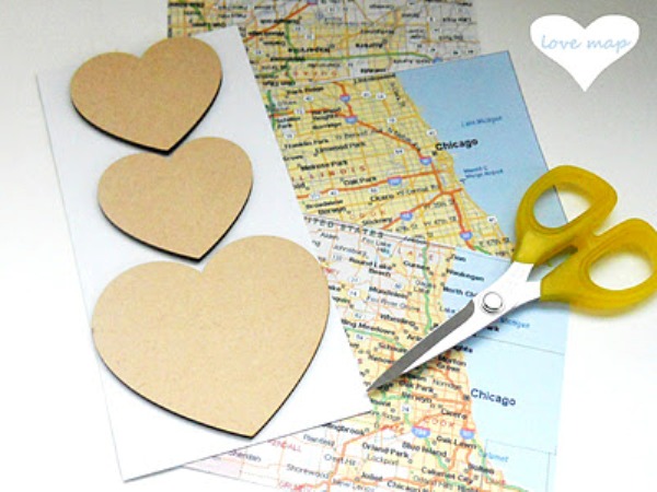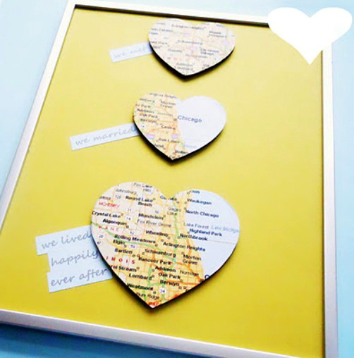 First you need to prepare a map of the city / country and mark on it all the places that are significant for the newlyweds (the place of the first meeting, the first date, the place where they are going to make their family nest), and each of them is cut in the shape of a heart. After that, the blank should be attached with foam tape to a piece of cardboard - this can be a volume picture. The entire blank should be inserted into the gift box and presented to the newlyweds.