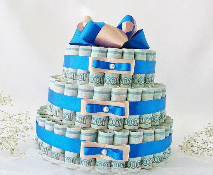 - money - but not in an envelope, but served in the form of a cake, a box of chocolates or a topiariya.