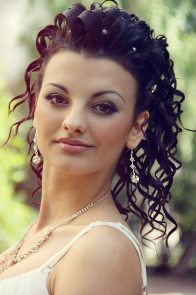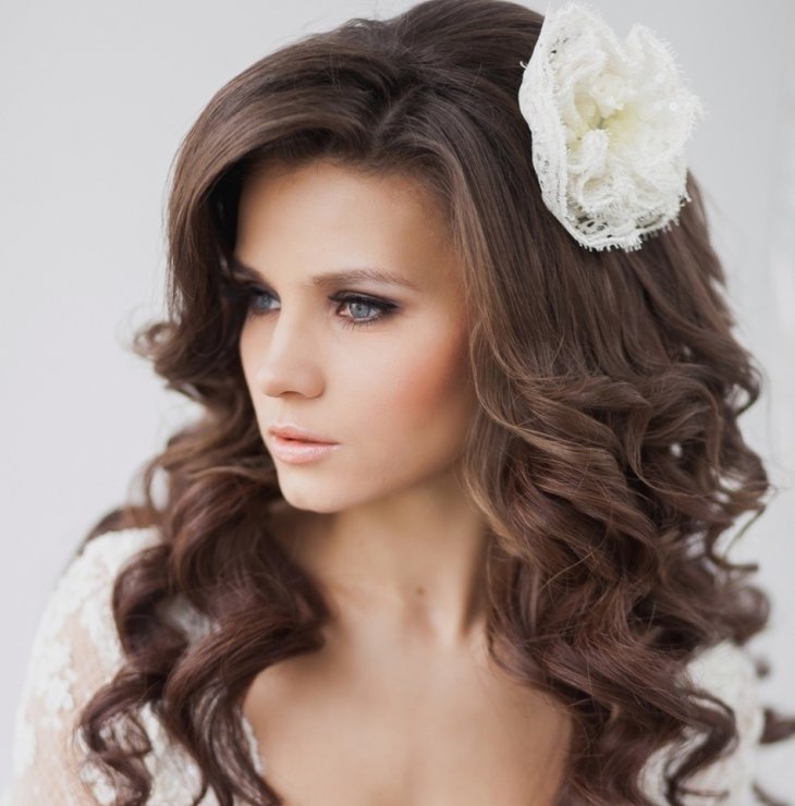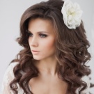 A hairstyle with curls will be a good choice. It can be done both with the grid, and without it. The laying begins in the middle of the head: a parting is formed from the center, the strand is fixed in a bundle. It can be laid in the form of a ringlet and decorated with a small flower bud. Similarly done with all the strands. It is worth paying attention to the styling turned out not oversaturated with decorations. On the sides are two curls.