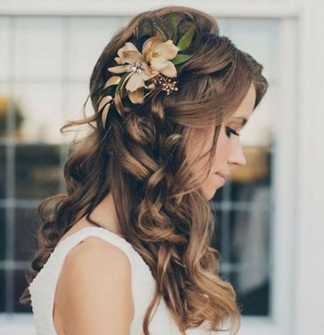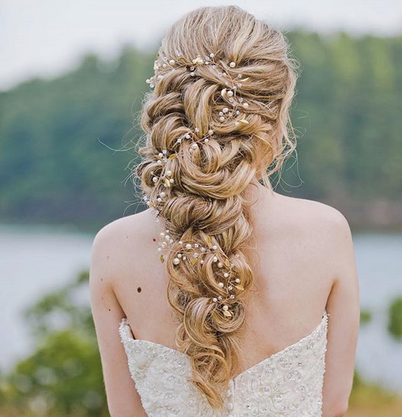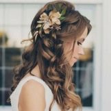 Owners of long hair can be styled with loose strands, for this they give a wavy look. First, before such laying, you need to create a volume in the root zone. This is done with the help of special powder. The hair is divided into separate locks, each of which is fixed with varnish or mousse. Then the strands are collected into a bundle and re-dried with a hairdryer, and as a result, chic and wavy curls are obtained. It is recommended to pinch the hair with decorative elements on the parting area.