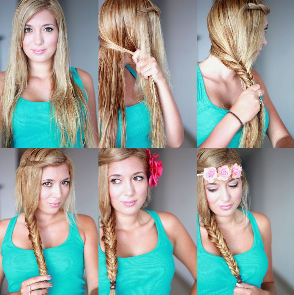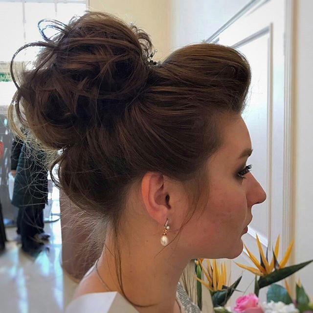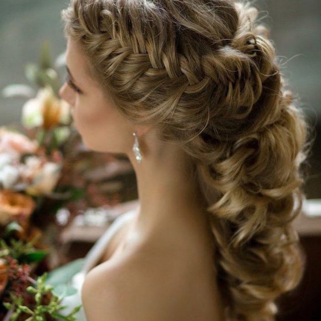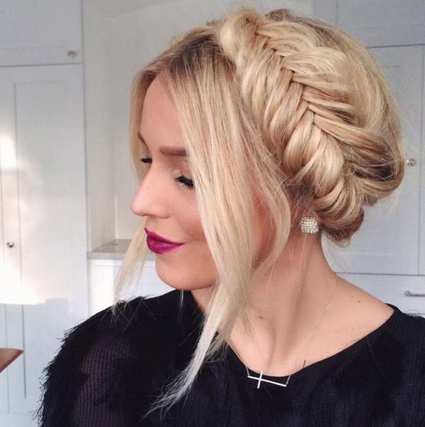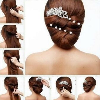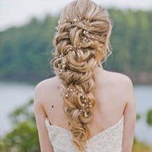If the witness chose a volume braid as an evening dressing, then with such a hairstyle you should practice for several days. To get the hair fluffiness, you need to learn how to properly place under the bottom of the strand, especially after you reach the back of the head during the process of weaving.At the end, the strands are collected in a beautiful bundle in the form of a shell and fixed with decorative pins. In order for the styling to “last” the whole day, it needs to be coated with strong fixing varnish.