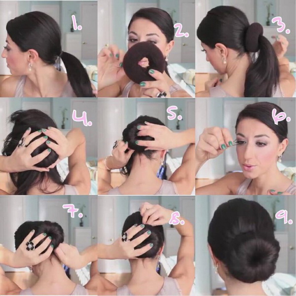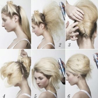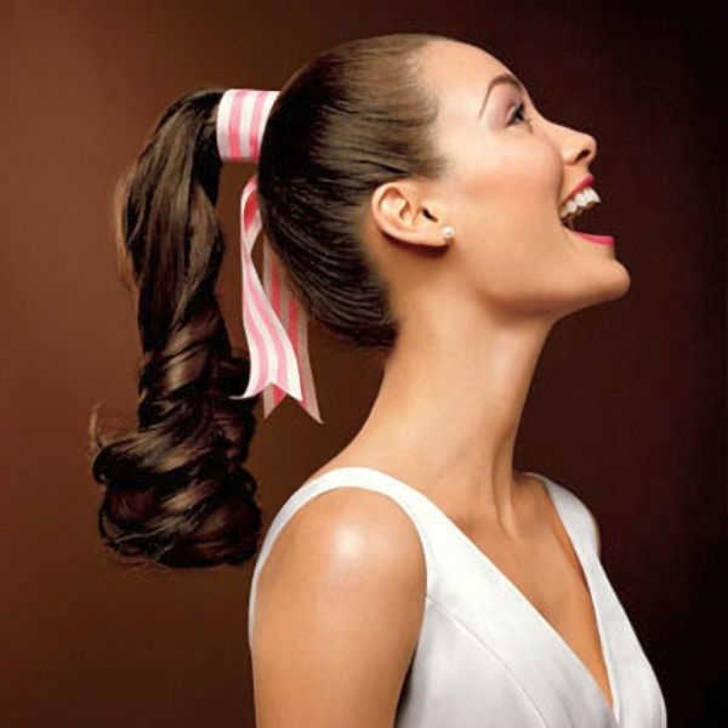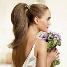 - "Ponytail". This option is most often chosen for girls with perfect face shapes. Ladies who have a high forehead should be avoided, as the oval of the face will further stretch. Laying is carried out using a flat comb, varnish, stealth and gum. A wide strand is separated and fixed with a rubber band, the rest are collected in the tail. It is important to ensure that the strands are put carefully. Invisibles need to choose a shade of hair.