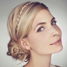 - "French" braid. This hairstyle is perfect for witnesses who have long hair. You can use it and young beauties with a short haircut, for this you only need to give volume to the curls at the expense of artificial strands, which are usually attached to hairpins. To create such an elegant and attractive braid, you will need a satin bow, thin elastic bands and hairpins. Laying start from the upper area of the bangs, while it is worth noting that the braid should not be weighed in the usual way, the strands in this case are placed under the bottom. The result is an original hairstyle with a convex shape.At will hair it is possible to decorate hairpins with pearls or colored stones, and in the center to place a satin bow.