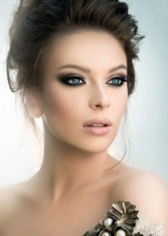- Smoky eyes. In this image, the main attention is paid to the design of the eyes, which are highlighted with arrows. As a result, the face acquires clear and regular lines, and the eyes become expressive and mysterious. For greater effect in the image is recommended to use hairstyles with collected hair. The ideal choice in this case is considered to be such a setting, as the "Greek" braid and "basket". To make the girlfriend of the bride look gorgeous, but at the same time not too glittering against the background of the bride, the gold and green shades should be used in the make-up.