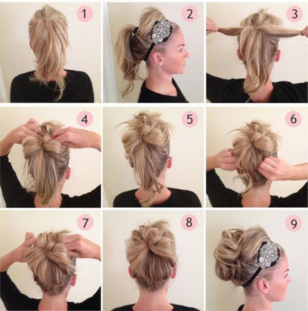 Beauties, who have medium-length curls, do not have to despair, because of them you can also make a beautiful and original styling yourself. The best option in this case is considered a high beam. Strands are carefully combed and, with the head down, gathering a ponytail. The hair must be fixed with a thick rubber band, otherwise the bundle will appear outwardly outwardly. Around the gum strands are evenly distributed and fastened with pins. To add romanticism will help a few curls, released on the sides.