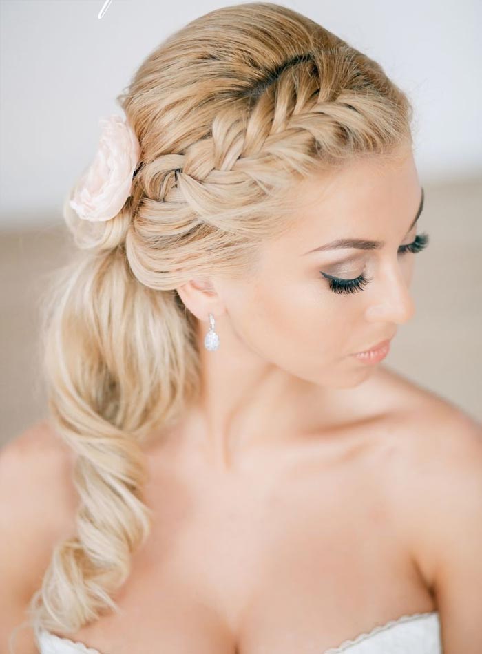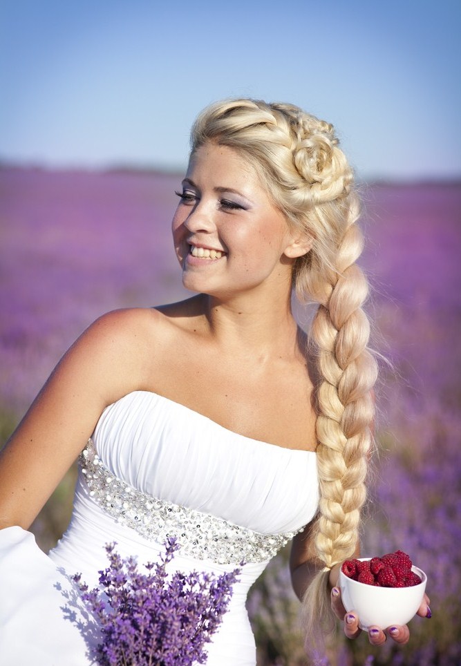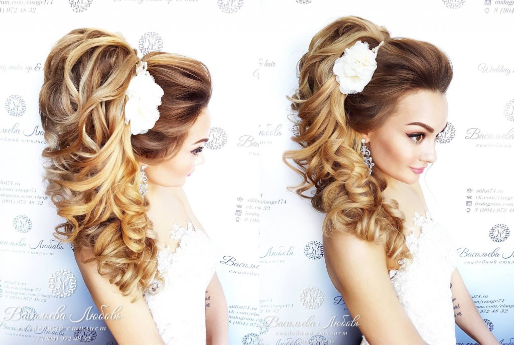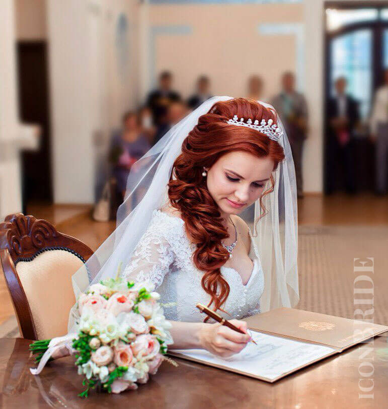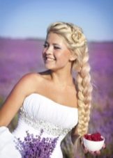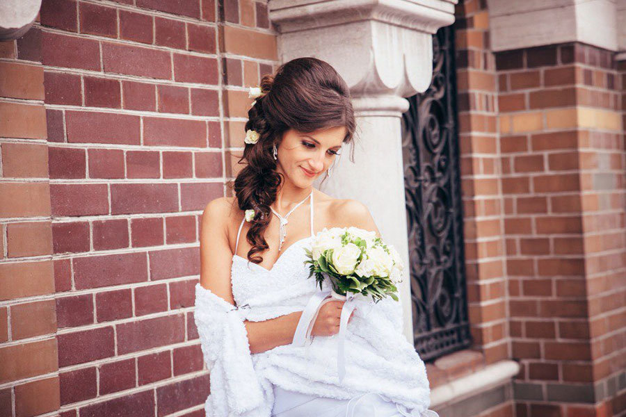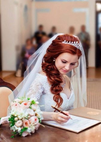 For girls with medium hair length, both cascades of tight curls, and complex weaving, and careless bunches are suitable. As for the happy owners of truly long strands, they will have to dwell on the original volumetric braid, because loose hair will create a lot of inconvenience to her during the wedding ceremony and feast.