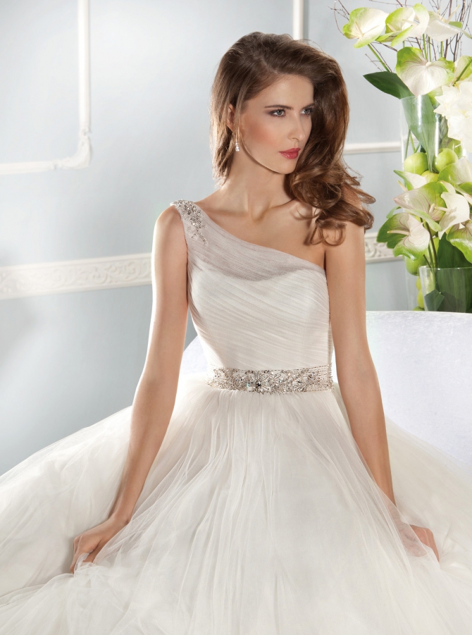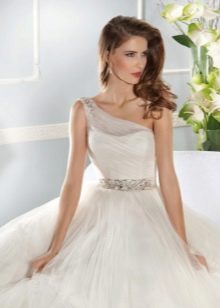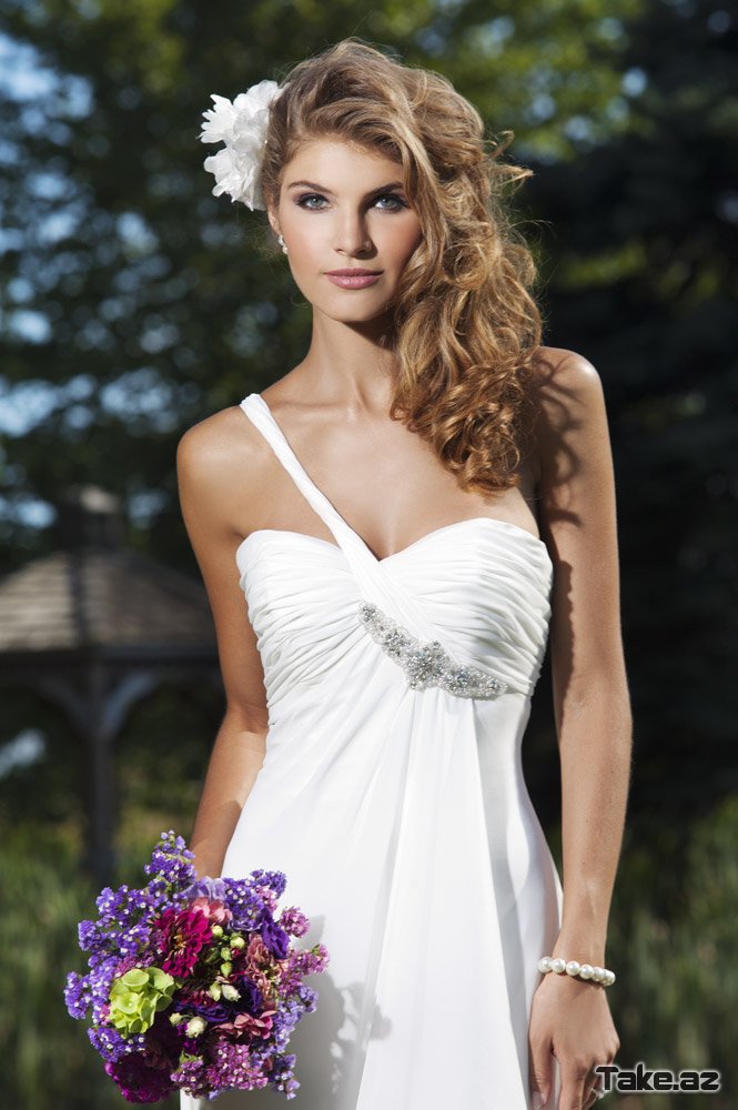 The optimal version of the dress in order to make laying on the side - this is a model with a strap on one shoulder. Such a style immediately creates an "overload" on the one hand, and it can be balanced just with the help of a hairstyle.