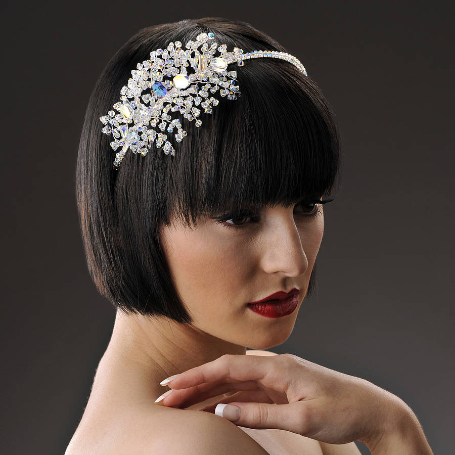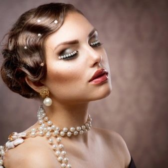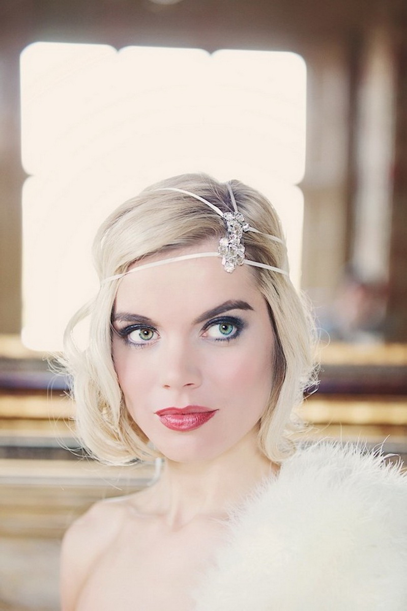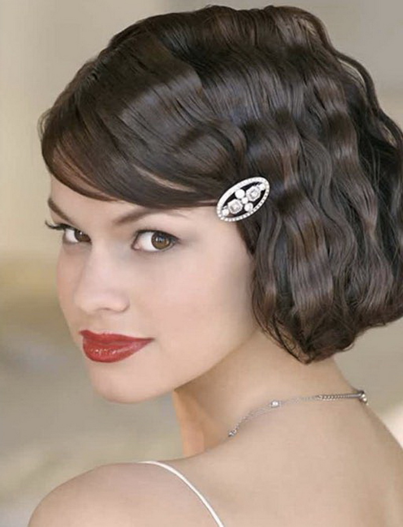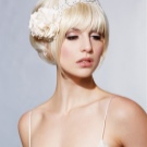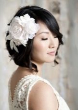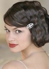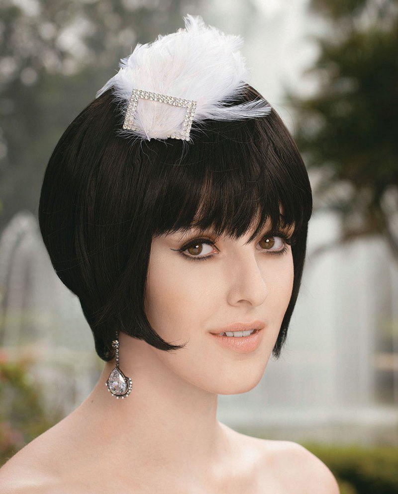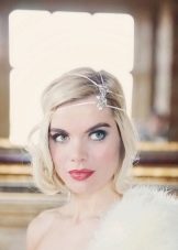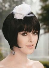 The simplest option is to give the hair volume by any means, then pick up the front strand from one side and stab it stealthily with a flower. If the haircut is very short, the hair is washed and blow-dried, at the same time distributing the hair from the top evenly over the entire head. Bangs and front strands pull forward. To even more smooth the hair, you should walk on them "ironing". We emphasize the individual strands of wax. The final stage is fixing with varnish and fastening from one side of the barrette with a flower decorated with feathers and rhinestones.