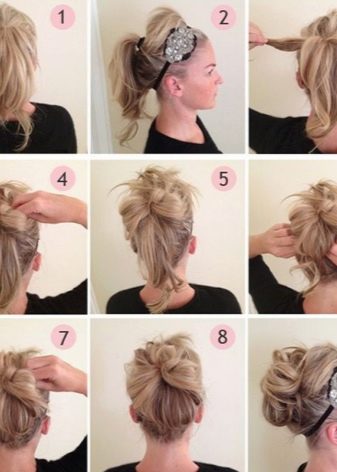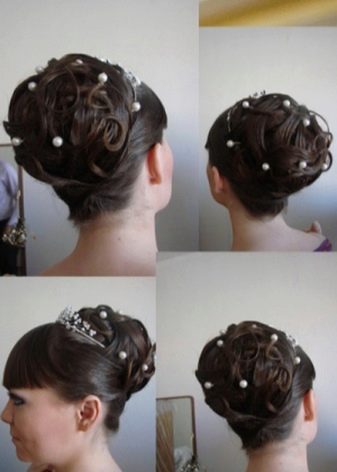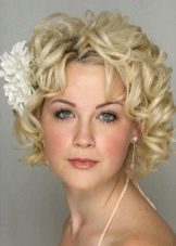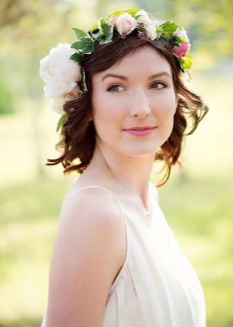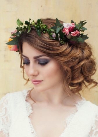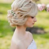 With the help of curlers or other devices to give the hair a voluminous shape. It is better if the diameter of the curls is large, then the pomp will be more natural. Laying decorate the bezel in the form of a wreath of small inflorescences and flowers.