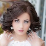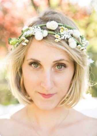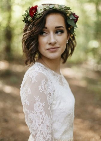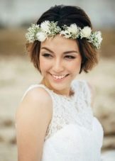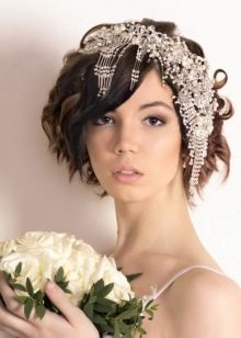 If the bride is trimmed under a square, then a hairstyle in the style of romance or chebbi chic is appropriate. In this case, the hair is wound on the curling iron of medium diameter, getting uniform curls. The front strands should be curled away from the face. Slightly comb the hair at the top of the head and wind it inwards with the help of a styler with a large-section attachment, creating pomp. Bang should curl on a thick curling iron and lay to the side. A tiara or tiara is attached to a fringe. At the same time, there should be a minimum of jewelry; it is better to refuse a necklace altogether; it is enough to use only earrings.
