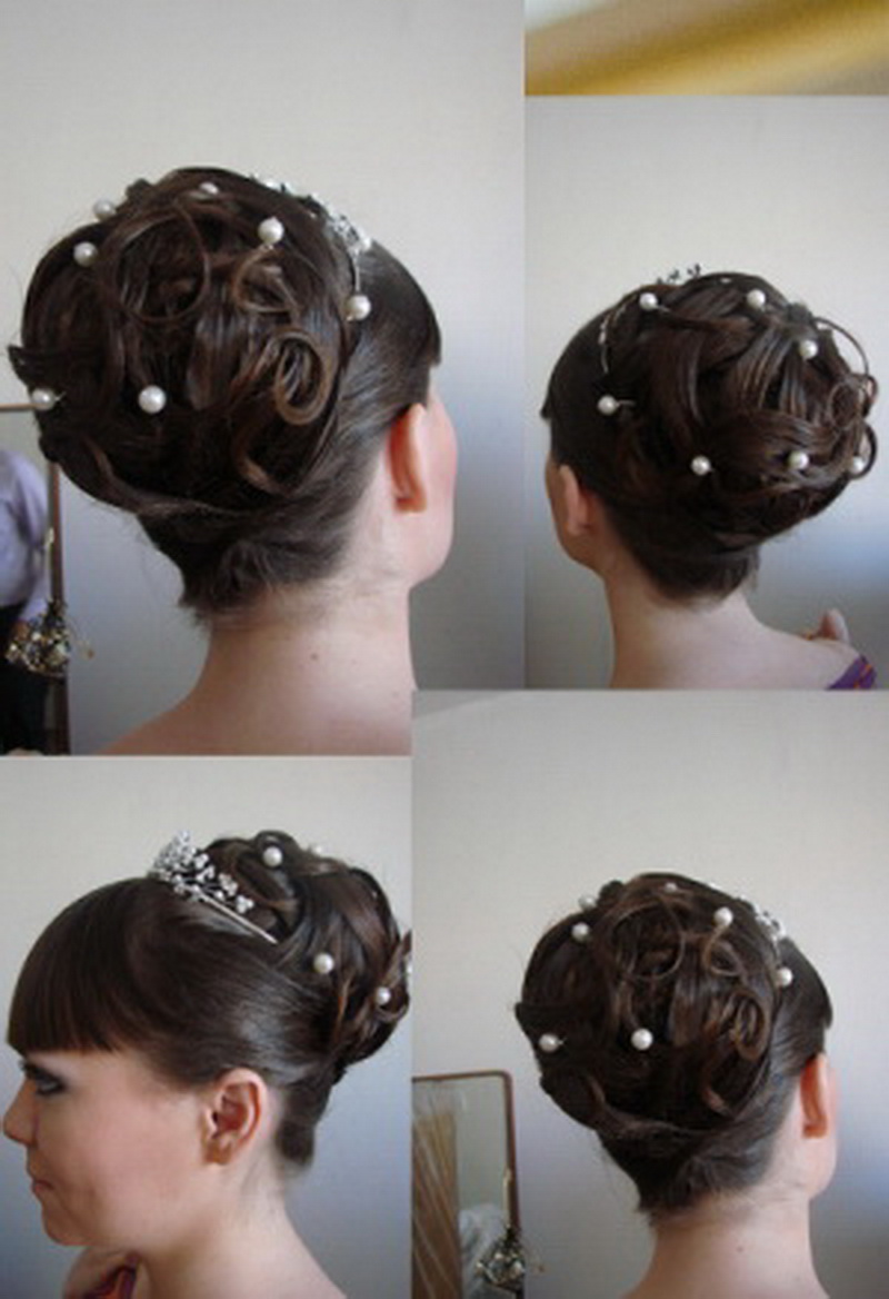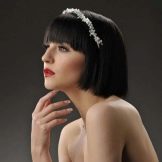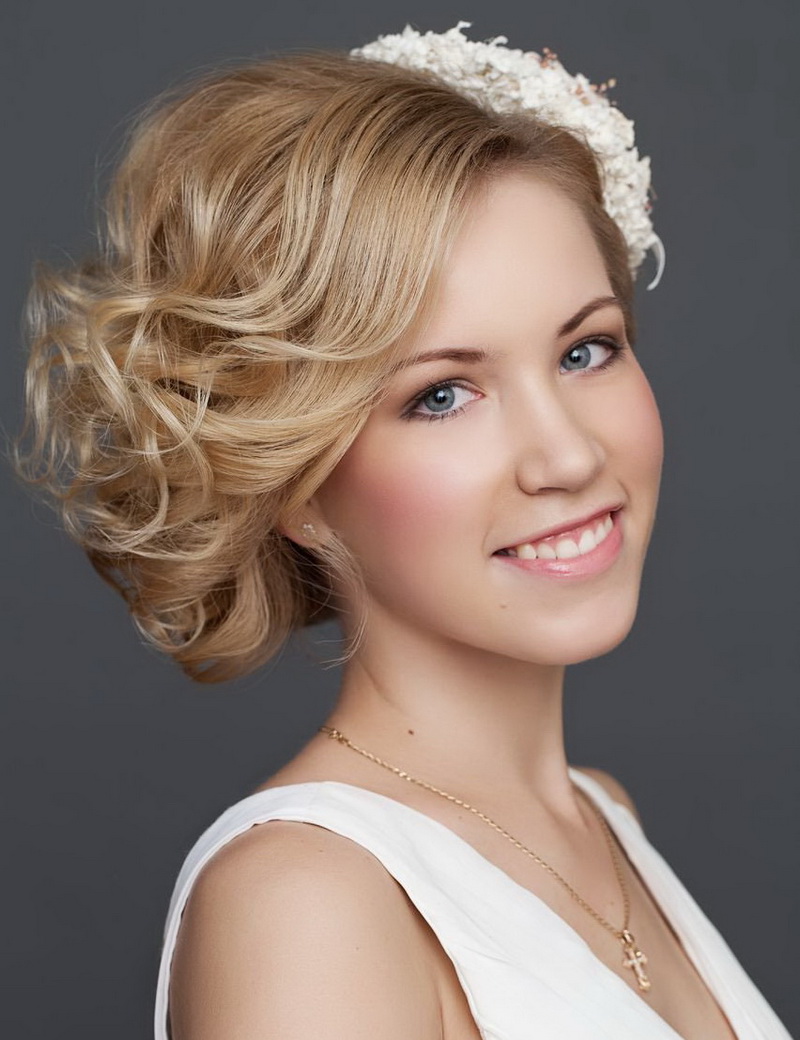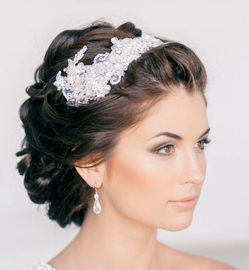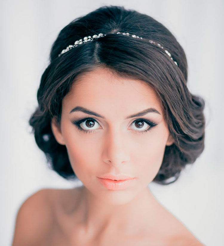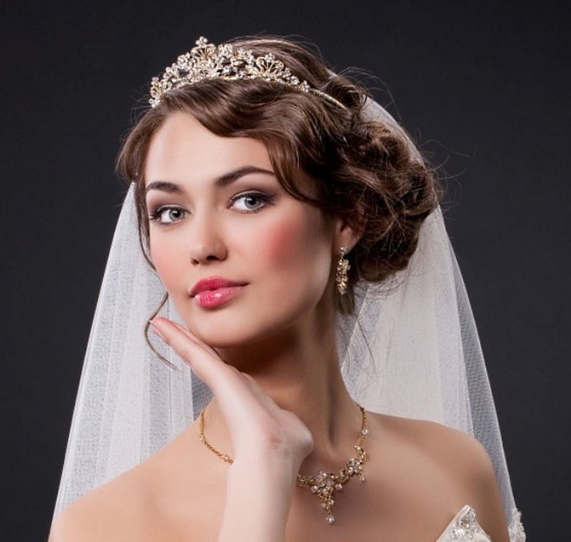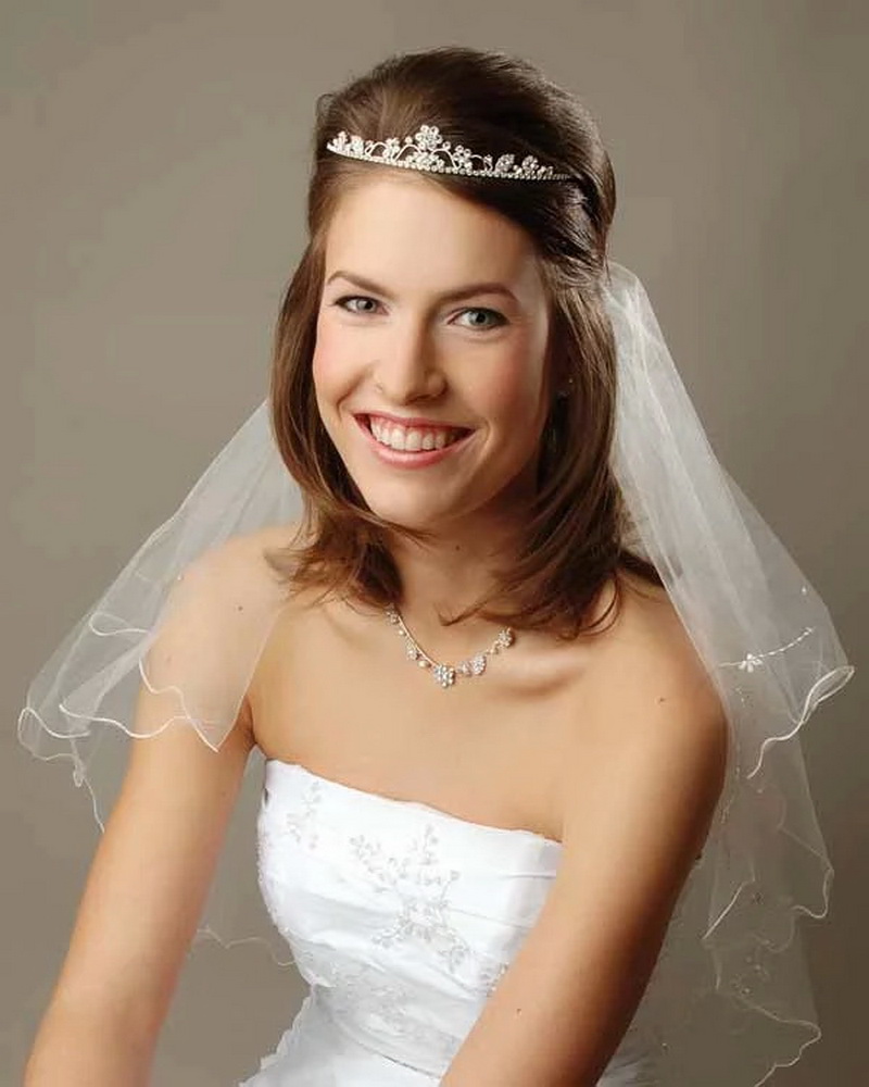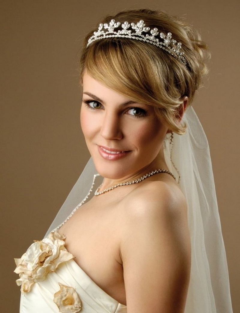 The tiara is loved by many brides as it turns them into beautiful princesses. In the presence of short straight hair should stretch them in the direction of the face with a styler-ironing. At the same time, the bang is slightly raised and laid in a large wave on one side. The diadem is attached between the bangs and the rest of the hair. Stylists are advised to choose the appropriate earrings and necklaces. They should not be cumbersome, so as not to overload the image.